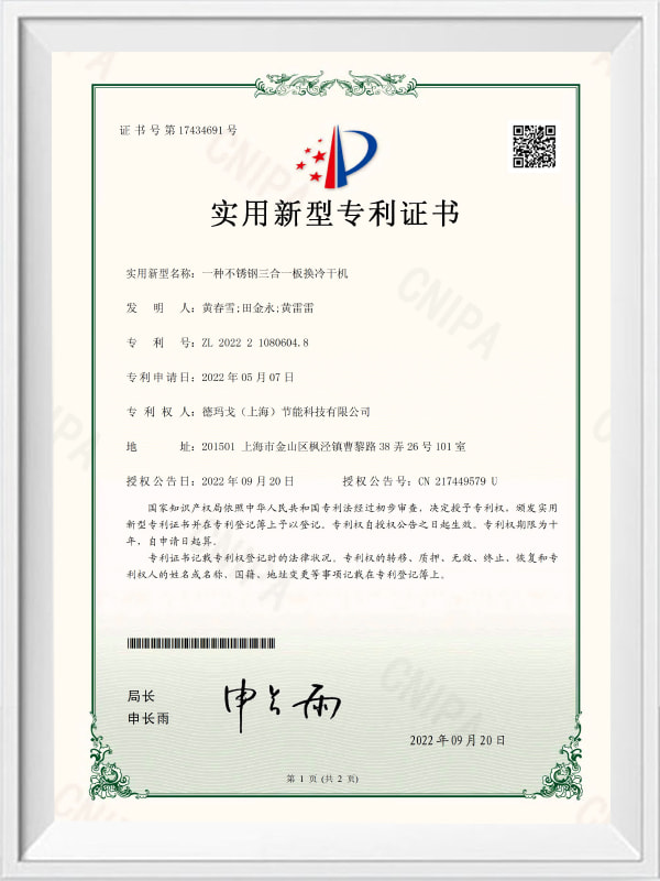 Isang hindi kinakalawang na asero na three-in-one plate-pagbabago ng malamig na dryer-utility model patent sertipiko