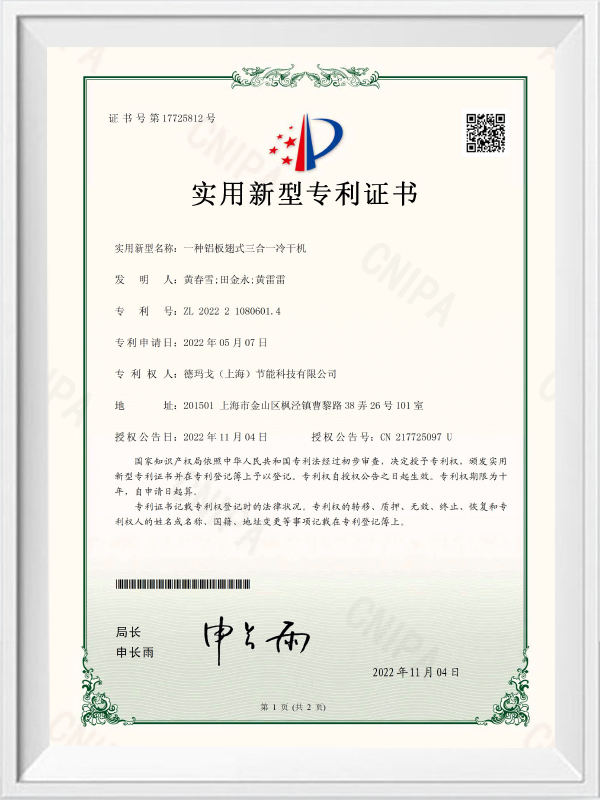 Isang aluminyo plate-fin three-in-one cold dryer-utility model patent sertipiko