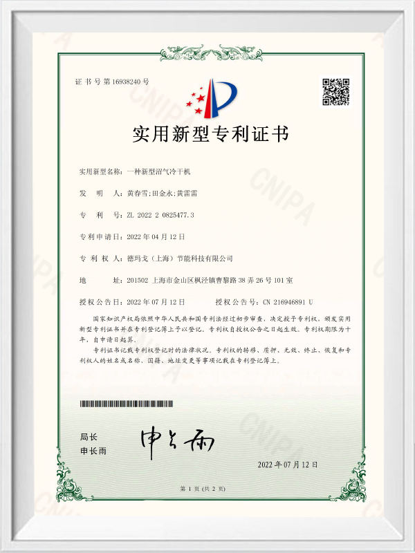 Isang Bagong Uri ng Biogas Cold Dryer-Utility Model Patent Certificate