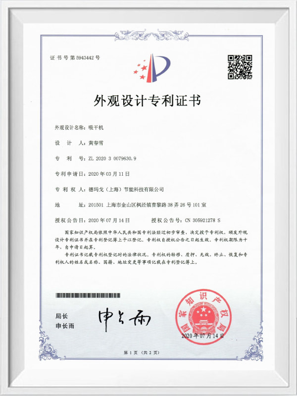Isang Zero Air Consumption Blast Heat na sumisipsip ng Dryer - Utility Modelong Patent Certificate