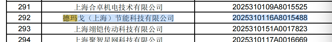 Sa mga napiling kumpanya, Demargo (Shanghai) Energy Saving Technology Co., Ltd. ay matagumpay na nailista, kasama ang registration code 2025310116A8015488 .